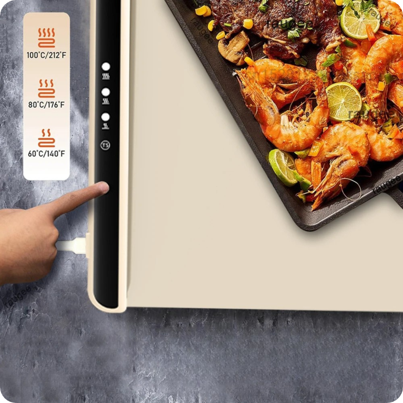 Yes — this warming mat offers three temperature settings to suit different needs: 60°C (140°F) for gentle warming, 80°C (176°F) for hot but safe serving, and 100°C (212°F) for maximum heat to keep dishes piping hot. You can switch between levels easily with a touch control panel.